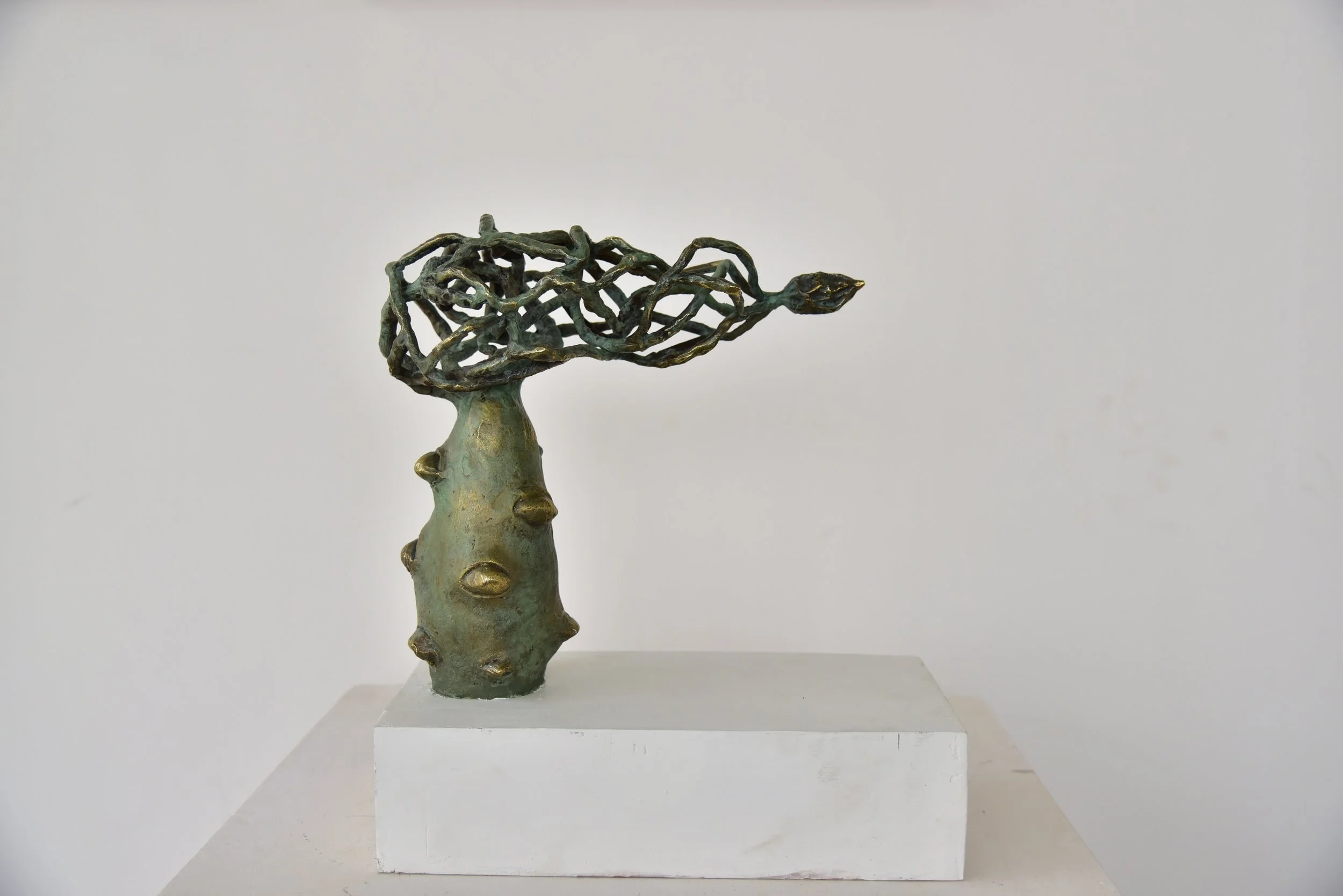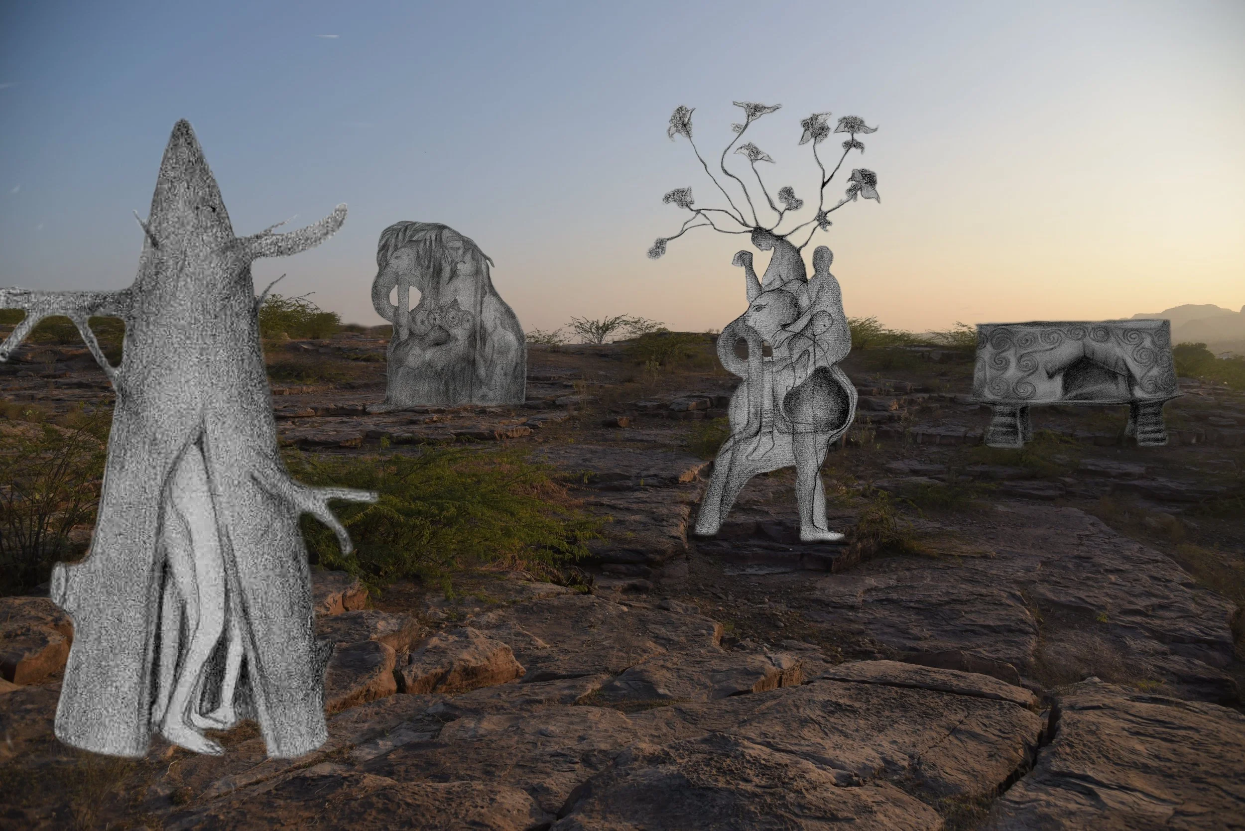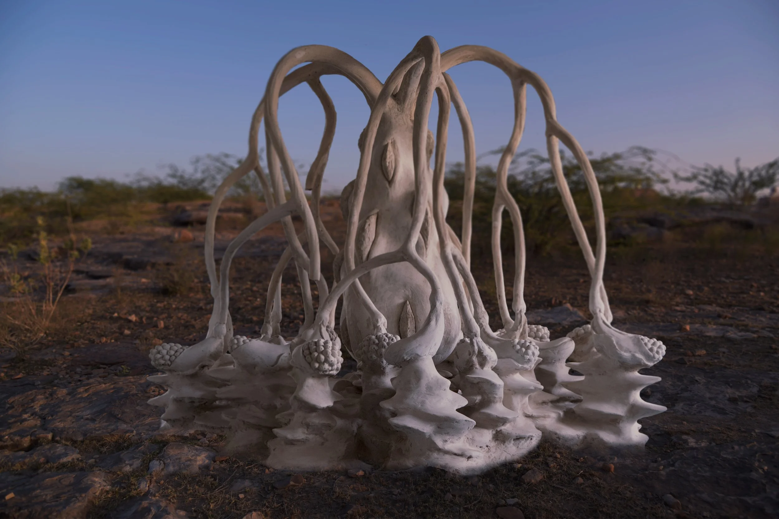 I enjoy the exploration of mediums, seeing how the same thematic engagement with ecology and ecological practices of desert communities can be explored through various materials - in the form of drawings, sculptures, and site-specific installations. All of them share a common idea of reference. I collect various native shrubs, cacti, tools, natural minerals etc. and study their form and structure as the basis for my drawings and sculptures. Exchanges with local indigenous communities such as the Bishnoi, Rebari, Banjara, and Meghwal etc. have also been important for me to understand ideas of collective memory, regional myths, the sacred significance of particular plants etc., which constitute the underlying vein of my practice.