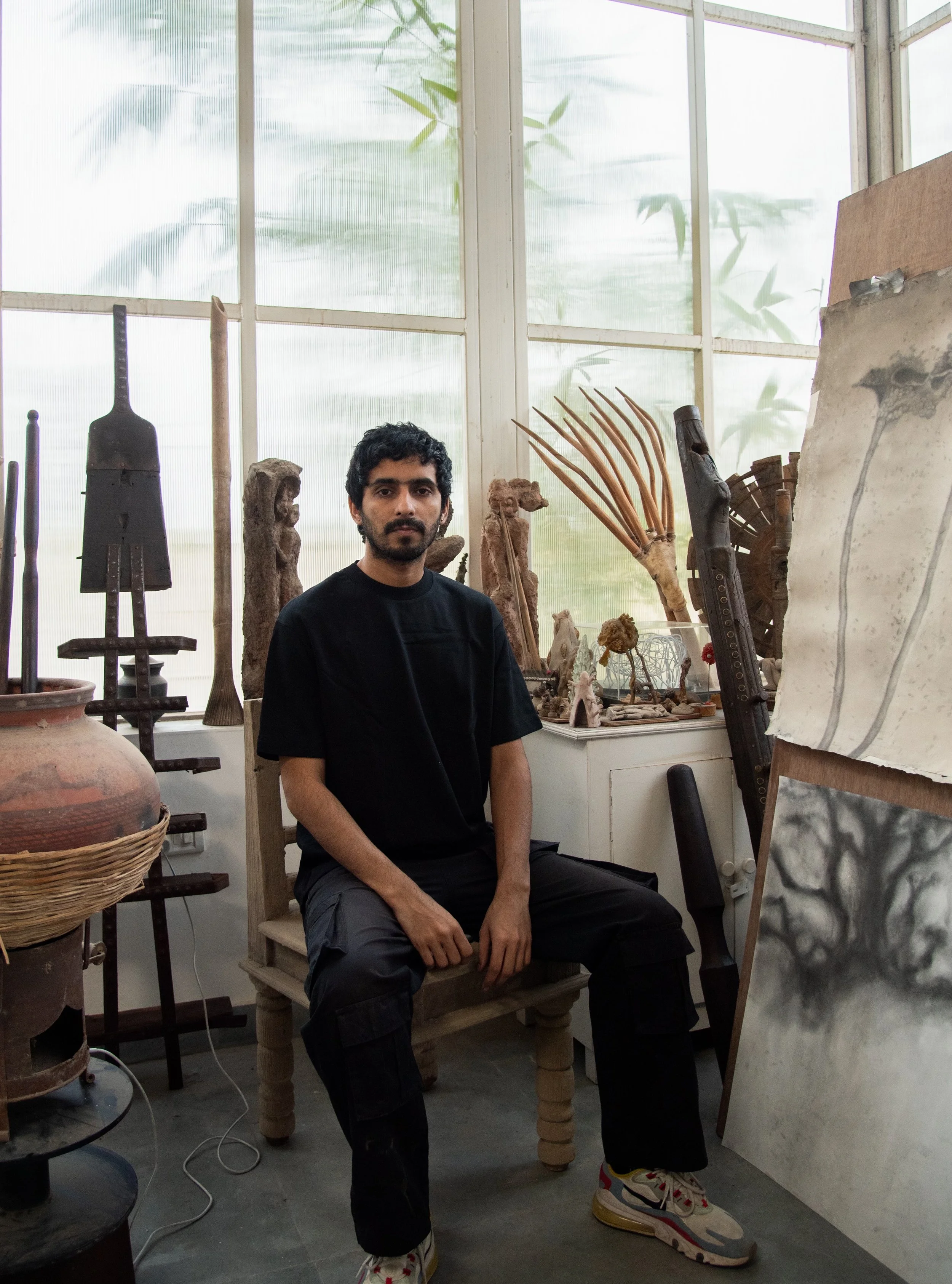 Bhimanshu Pandel (b. 1995) is a visual artist and researcher based in Rajasthan, India, whose practice explores ecological and cultural elements in the desert landscapes of the region. Rooted in his family’s agrarian heritage, his work engages with native plants, regional myths, cultural tools, and natural minerals to explore the living histories of indigenous communities. He works across drawings, sculptures, and site-specific installations.