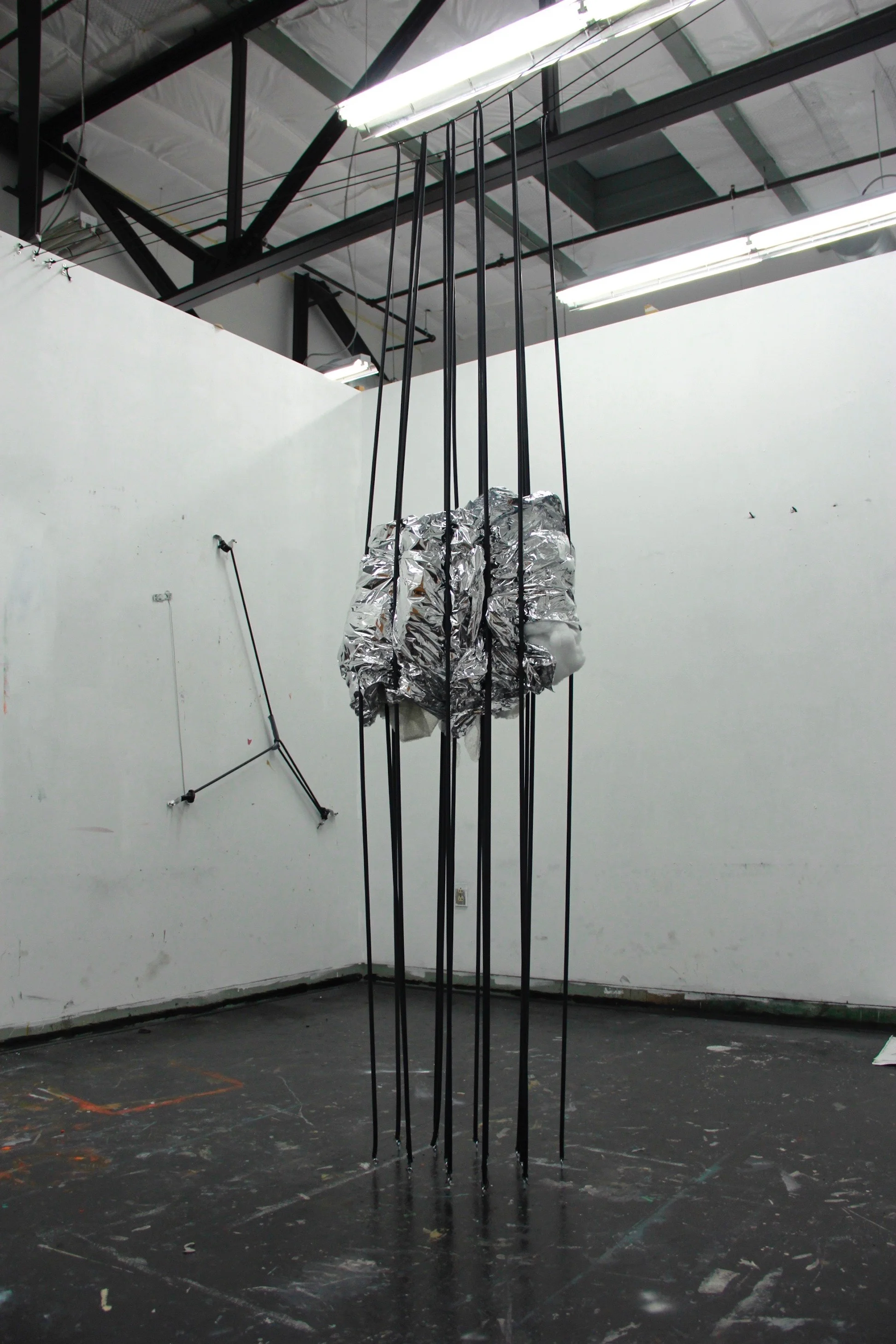 C: Absolutely. I view it as a drawing. I just think that sometimes it’s easier to explain it as a sculpture or installation. When I was making it, the physical challenge of stretching it from the floor to the top was really important- that tension and how the lines were being pushed by the mass that in the center which is made out of a space blanket that’s wrapped around batting and bubble wrap. It’s like squeezing this very vulnerable thing. I felt like the space blanket was referencing metal or something that’s hard and cold. No matter what medium I am using, it is all coming from the same thought process.