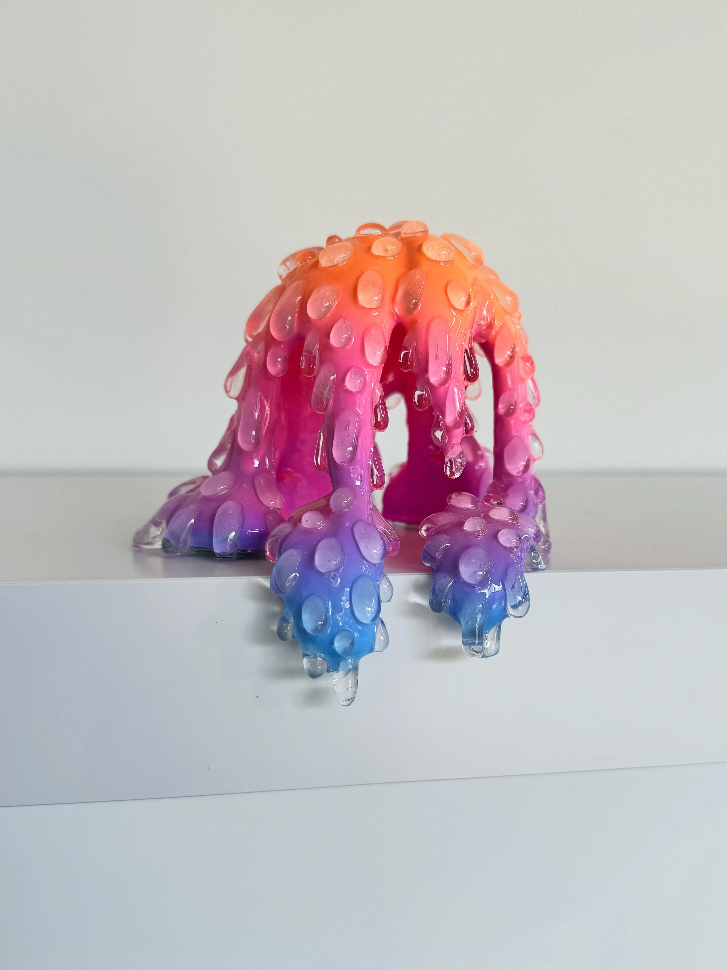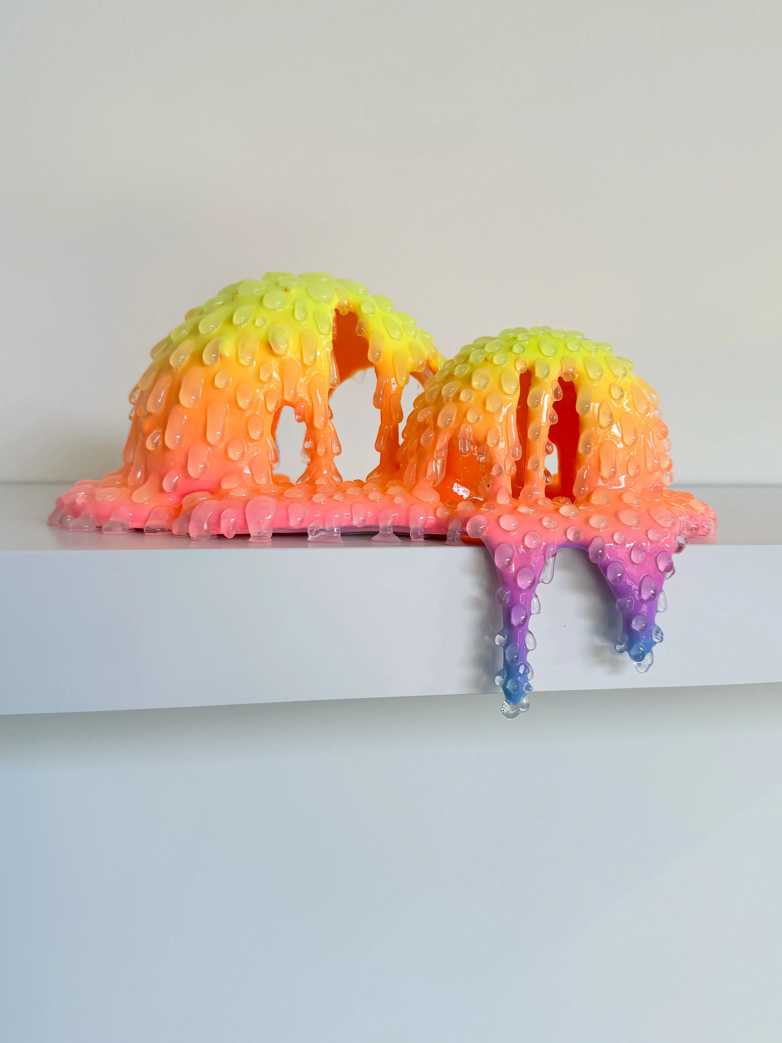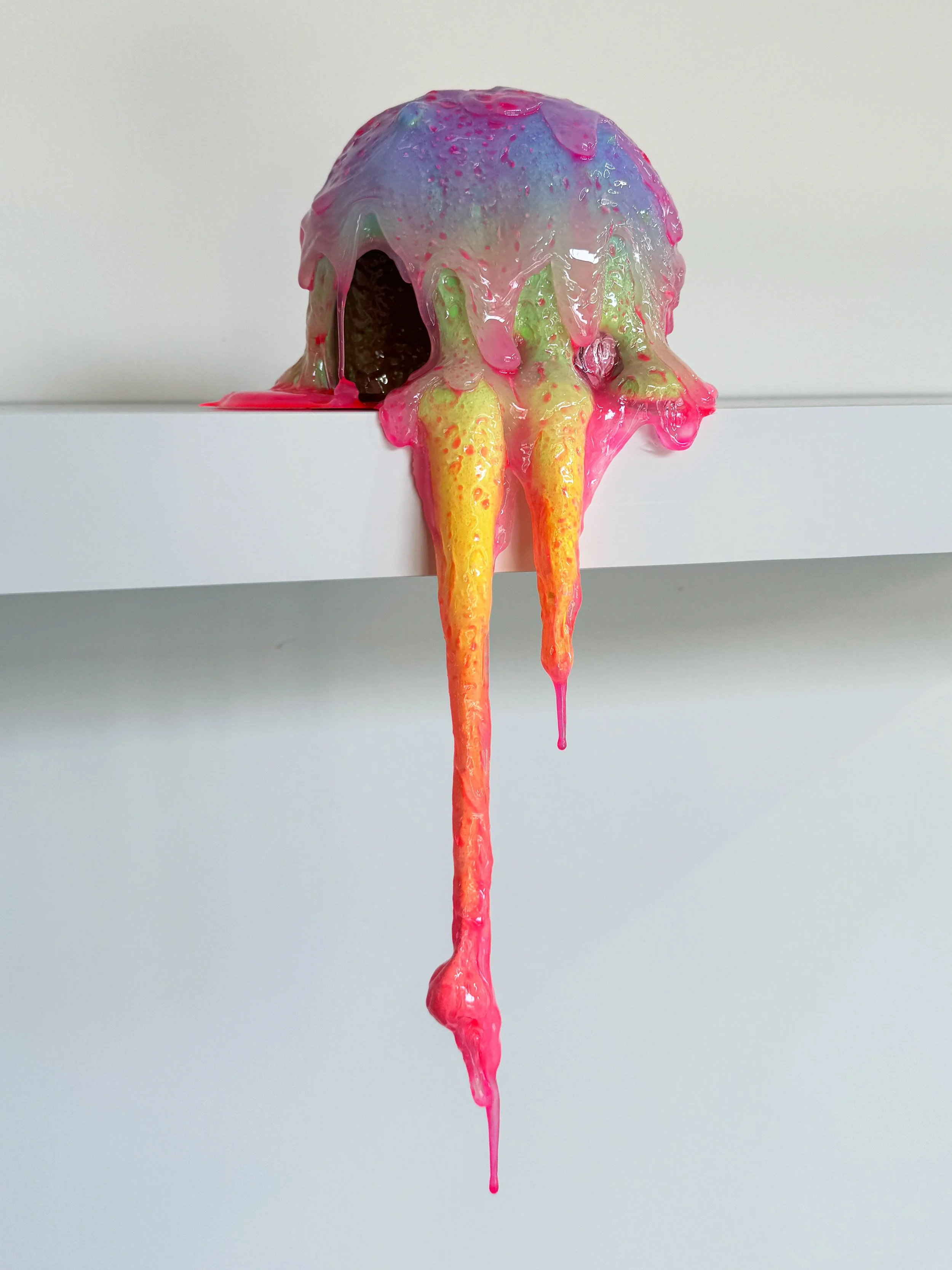 Known for her colorful drip sculptures, the techniques used to create this body of work mark a new period of studio exploration that resulted in fresh textures and colors. With the sensibilities of a mad scientist, the young artist mixes and pours elixirs of artificial and natural plastics, including resin, polyurethane, foam, and acrylic, to conjure her bizarre, grotesque forms. Adding dots of blue, purple, red, or brown under a translucent epidermis, Lam pushes familiar materials into unconventional embodiments, daring viewers to confront their own entitlement to a “beautiful” art object.