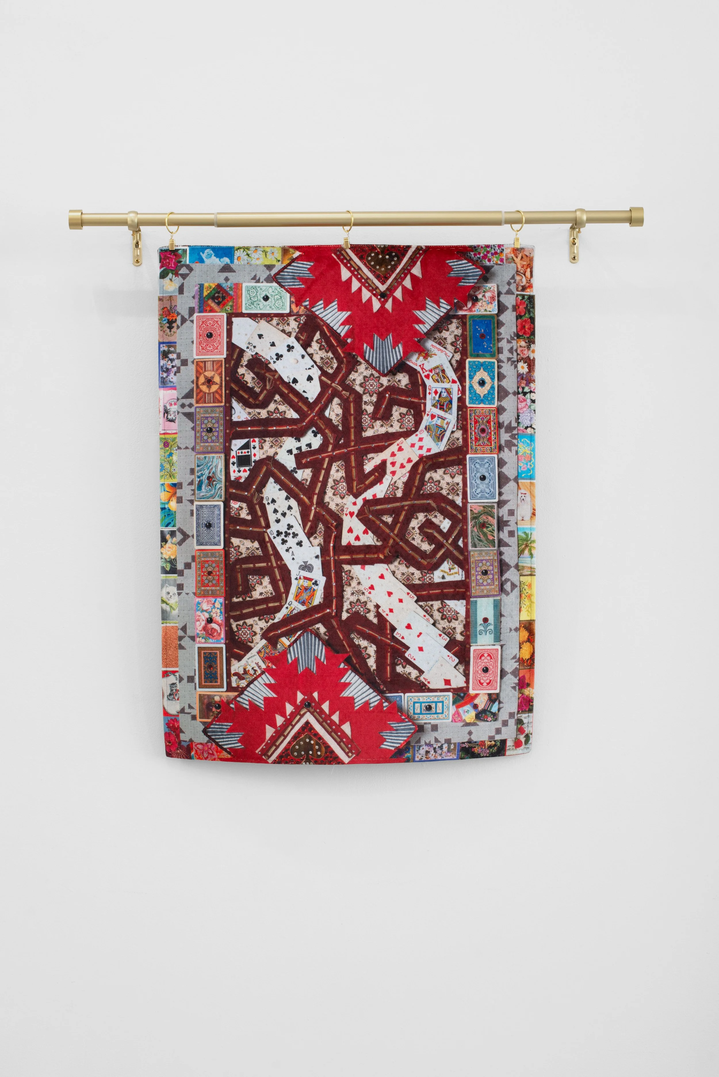 While the rugs reference unattainable, handwoven opulence, they are produced through a craft-based collage process – a common aesthetic of vernacular folk art. With the original collage being an ephemeral part of the production process, the final works are offered to collectors as an accessible print edition. The series intentionally diminishes the aura of the singular object, creates a tension of desire between the viewer and object through the flattening of texture-rich, 3-D objects (a process we may experience through screens on our phones), and allows the final pieces to have a utilitarian purpose as an actual rug, if so desired.