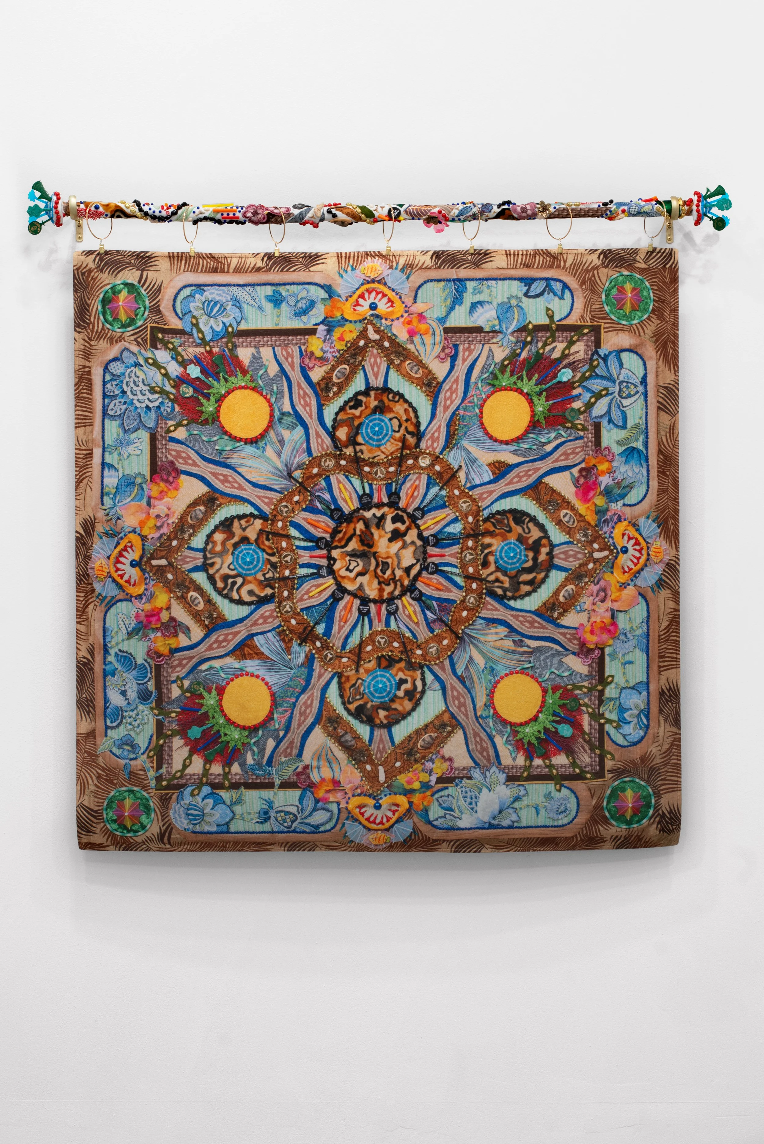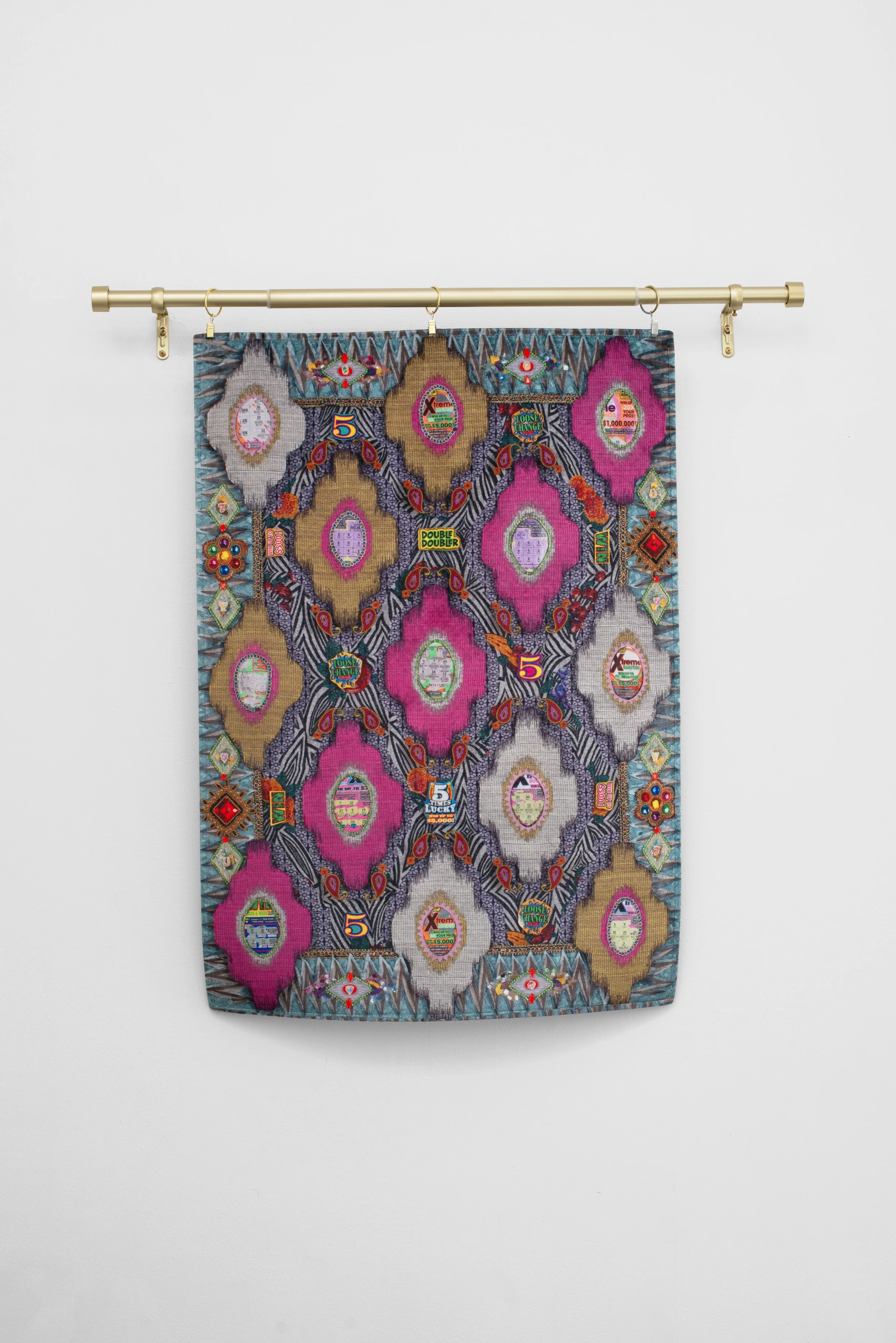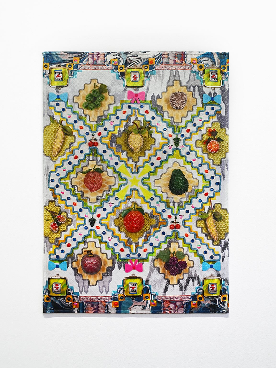 The designs are enchanting, yet the elements that constitute them are discarded, cheap, artificial, or dead. A questioning of perceived value is played with here, by luring the viewer in with luxury aesthetics before revealing the work’s kitsch qualities. Their imagery references places of desire where busy carpets exist – conference centers for trade shows, elaborate palaces from a bygone era, perhaps the casino floor –spaces designed to keep consumers hopelessly spending under the illusion of attaining or becoming something more.