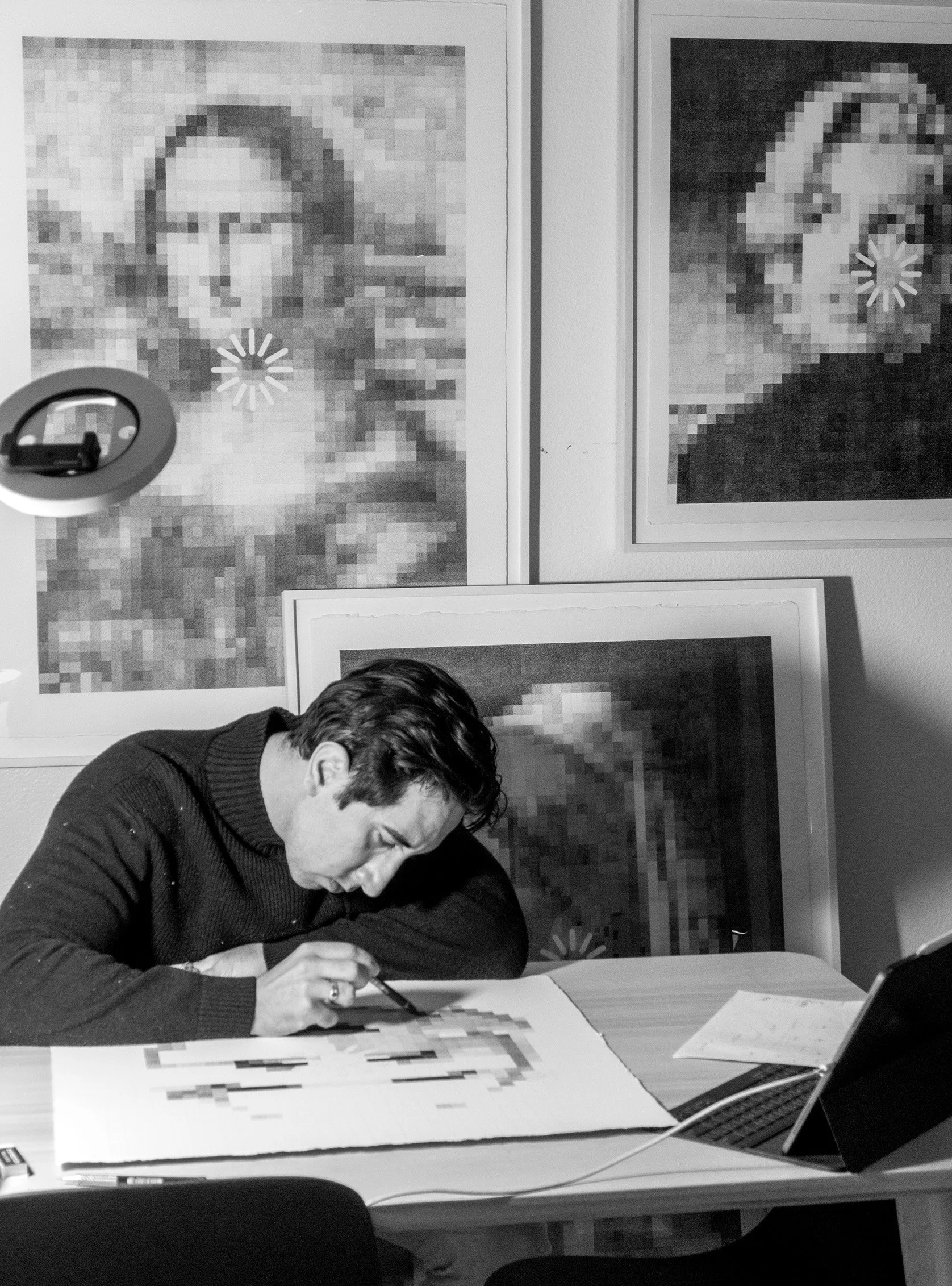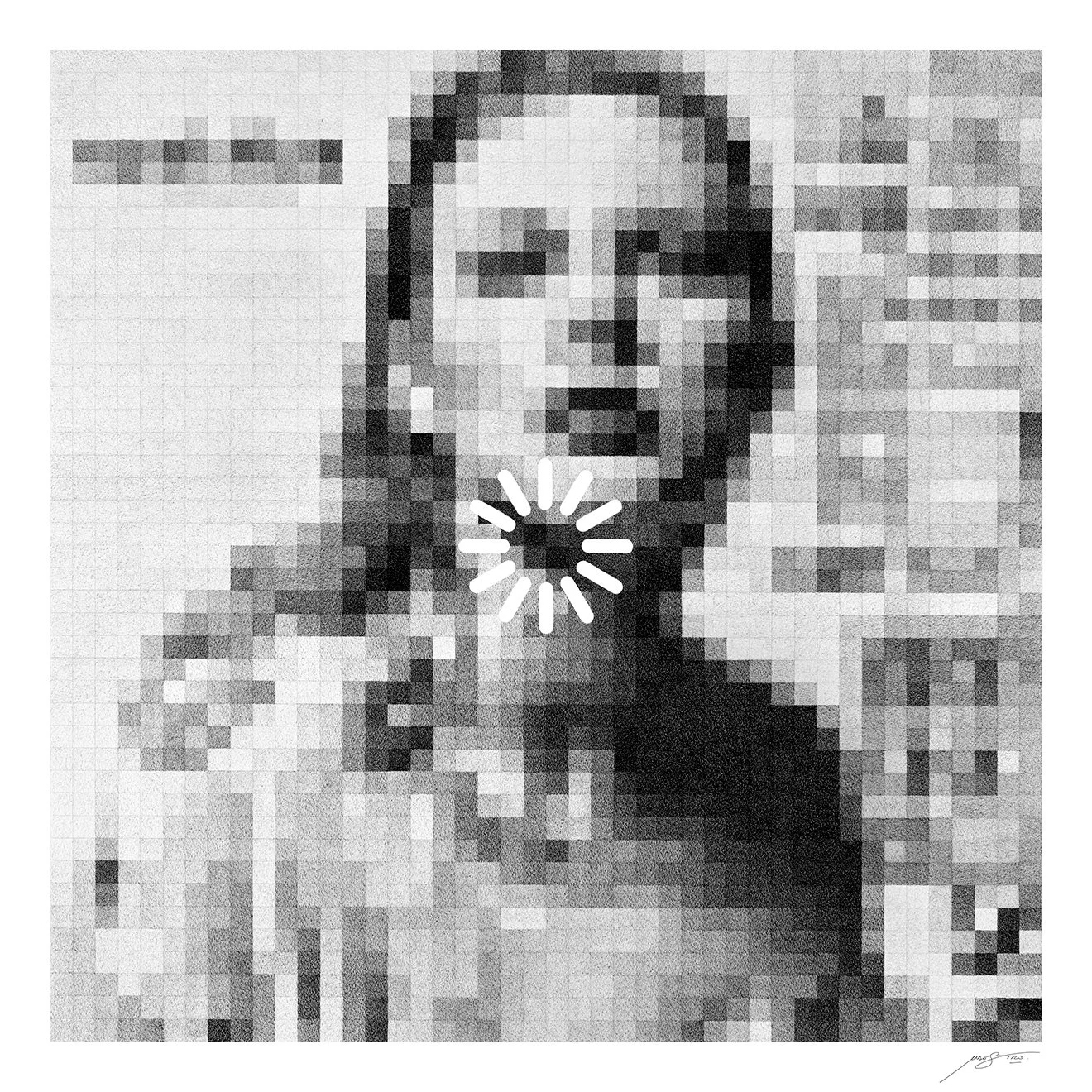 Pixels are essentially digital atoms. Every image you’ll ever see through your computer or phone screen consists of them, just in a greater or lesser concentration. My work plays with that concentration, asking how many pixels are sufficient to make an “iconic” subject legible to a contemporary viewer. The subjects themselves are selected for their timelessness—their capacity to fascinate and the magnitude of their cultural impact. My focuses right now include iconic cultural figures, historical events, and art objects of the past.