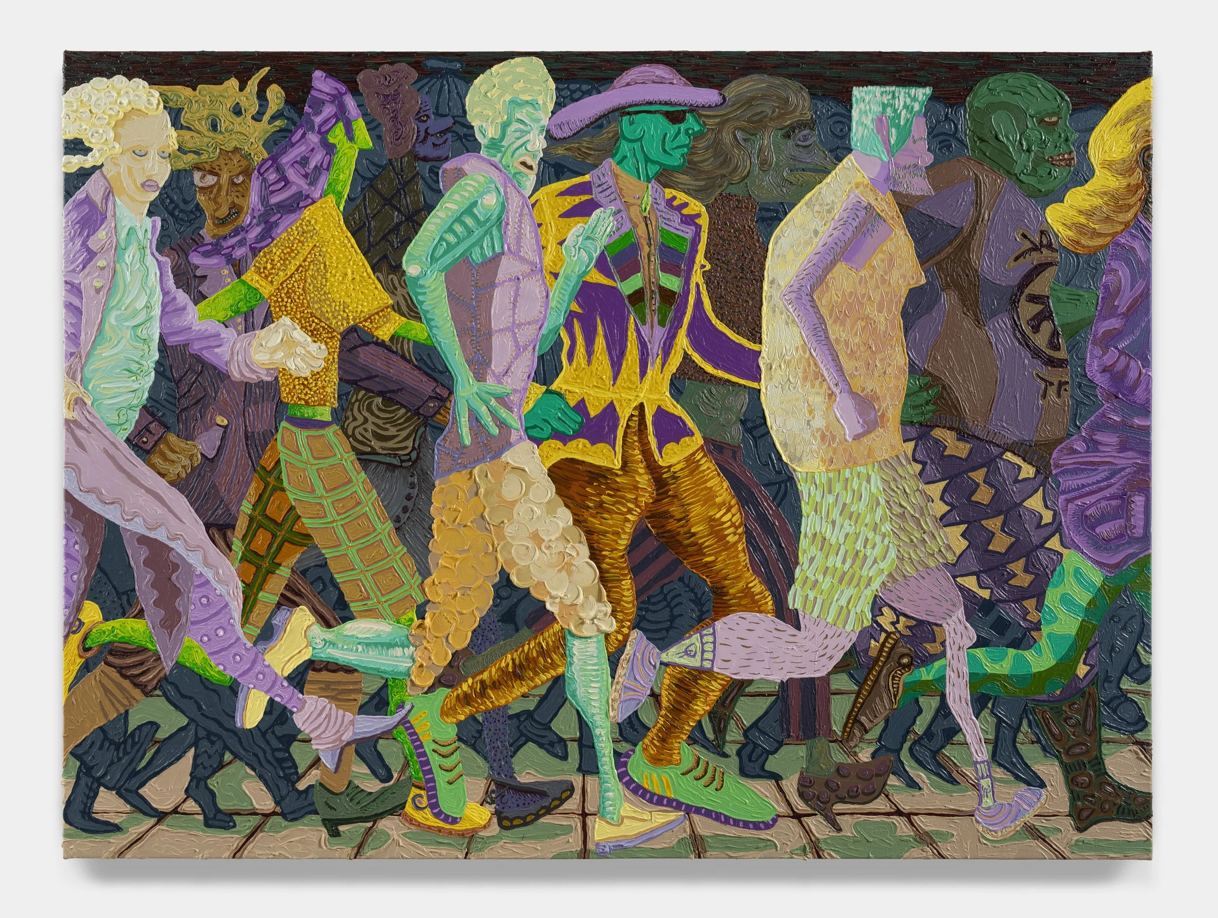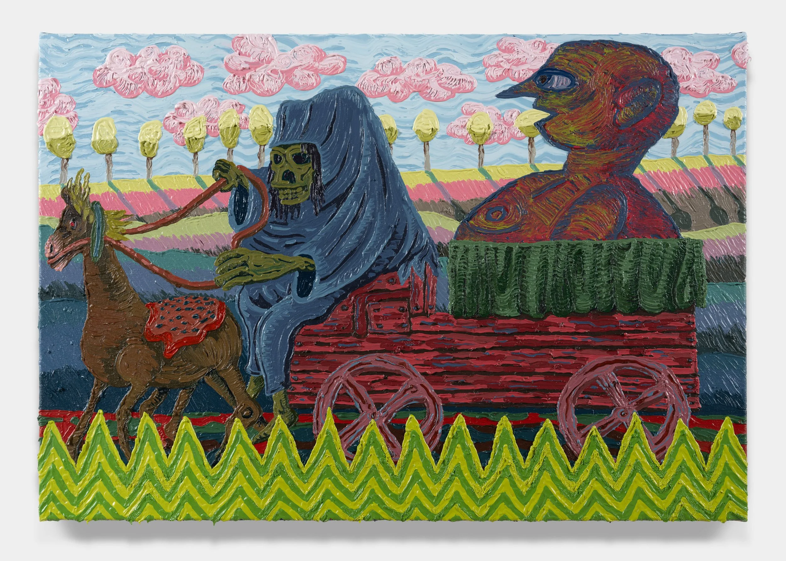Mark Frygell’s works depart from the history of painting, sub-cultural images and cartoons. He repeatedly manipulates and reworks gestures, references and materials, inspired by different methodologies of painting. His interest lies in concepts such as caricature, the grotesque and the comic.