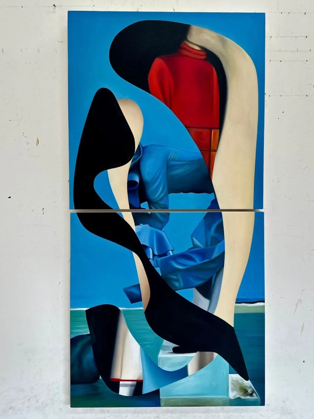 A sense of discomfort and dissatisfaction during my university years drew me to painting as an escape from formality and rationality. I studied architecture and then design, and while I am deeply grateful for that schooling, I realized it wasn’t my path. I was captivated by moments when I could create purely from my emotions, without any “reason”—those times when everything felt right, almost like building a parallel world without rules, or at least with only my own, which I love to break. In that world, I feel free, whole, and happy. A utopia, my own.